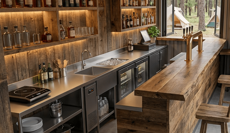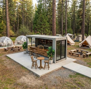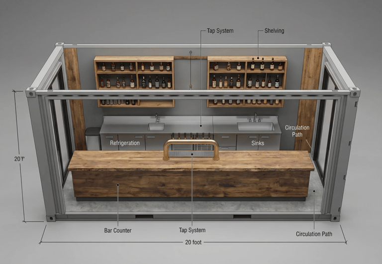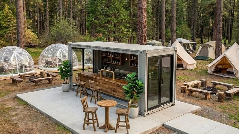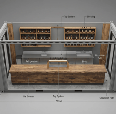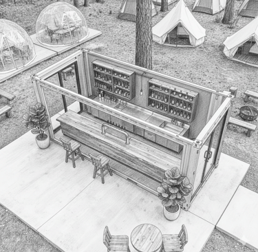 Pre-construction visualizations illustrating a container-based retail bar concept. Images are intended for design exploration, spatial planning, and stakeholder communication prior to construction. Renderings are conceptual and do not represent a specific manufactured product or construction-ready drawings.